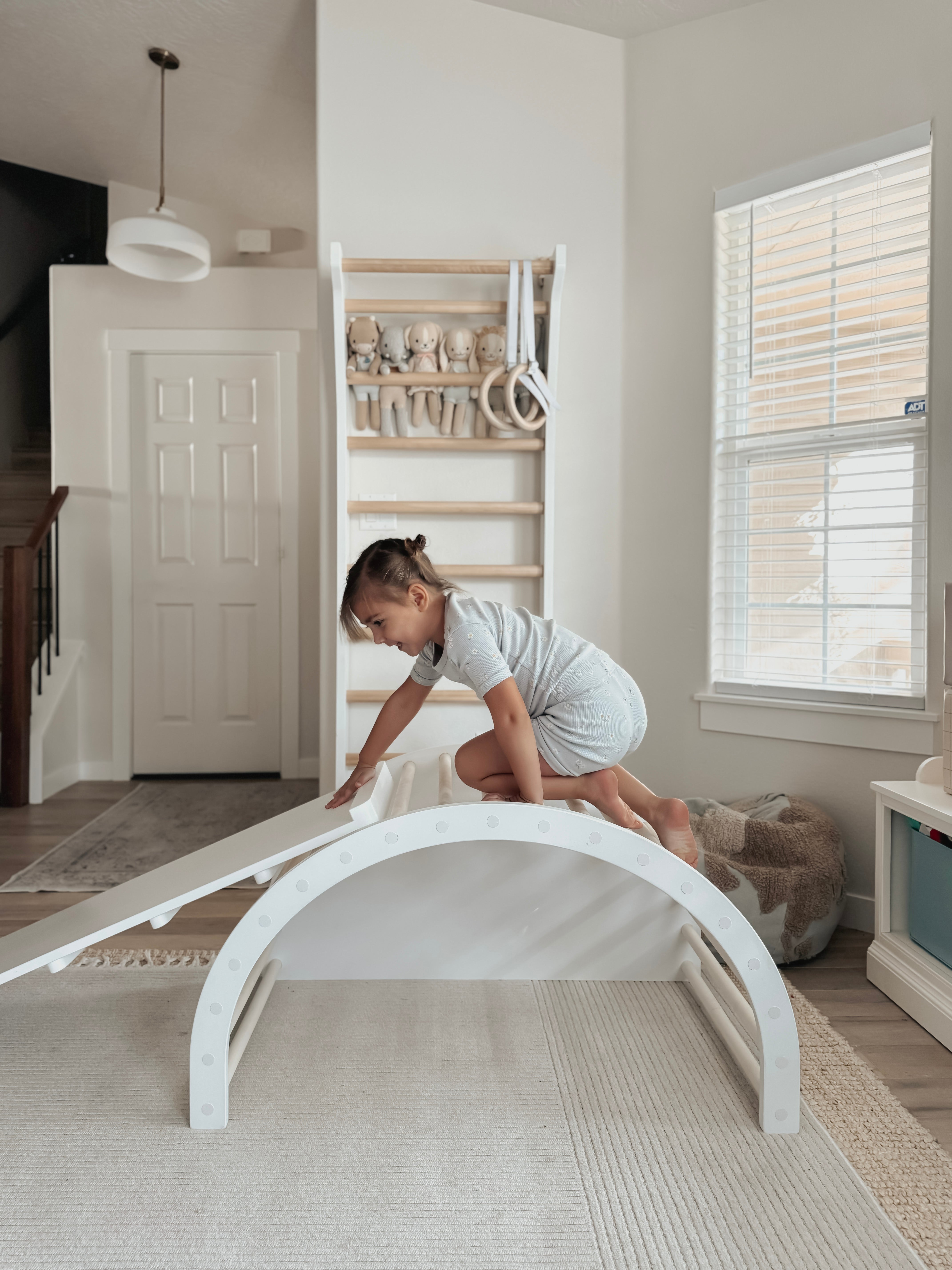 Beyond climbing, the arch can also be used as a rocker, a cosy hideout, a football goal, a children’s table, a toy storage solution, or even as a side table or home workspace.
